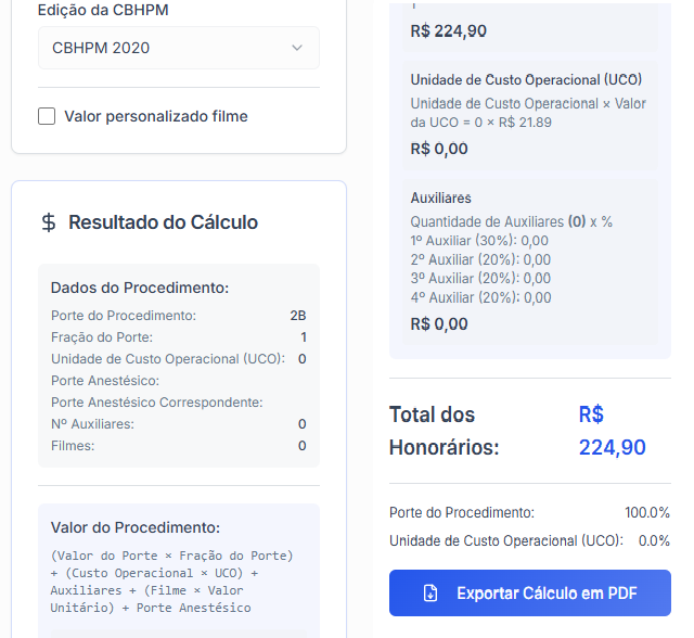 Clique em “Calcular” em qualquer procedimento. Insira dados reais de um caso que você atendeu recentemente.